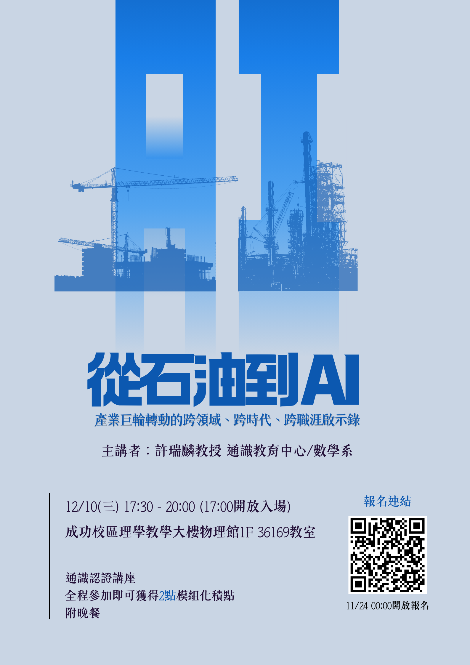 【M沙龍X通識講座】從石油到 AI - 產業巨輪轉動的跨領域、跨時代、跨職涯啟示錄 時間:2025-12-10 (三) 17:30~20:00 (17:00開放入場) 地點:成功校區 理學教學大樓 物理館1F 36169教室